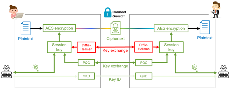 Az Adva Network Security ConnectGuard™ megoldása nemcsak hagyományos (pl. AES-256) és posztkvantum kriptográfiai (PQC) algoritmusokat alkalmaz, hanem képes kvantumkulcs-elosztás (QKD – Quantum Key Distribution) integrálására is. A rendszer az European Telecommunications Standards Institute által definiált ETSI GS QKD 014 szabvány szerinti interfészen keresztül csatlakozik QKD rendszerekhez.